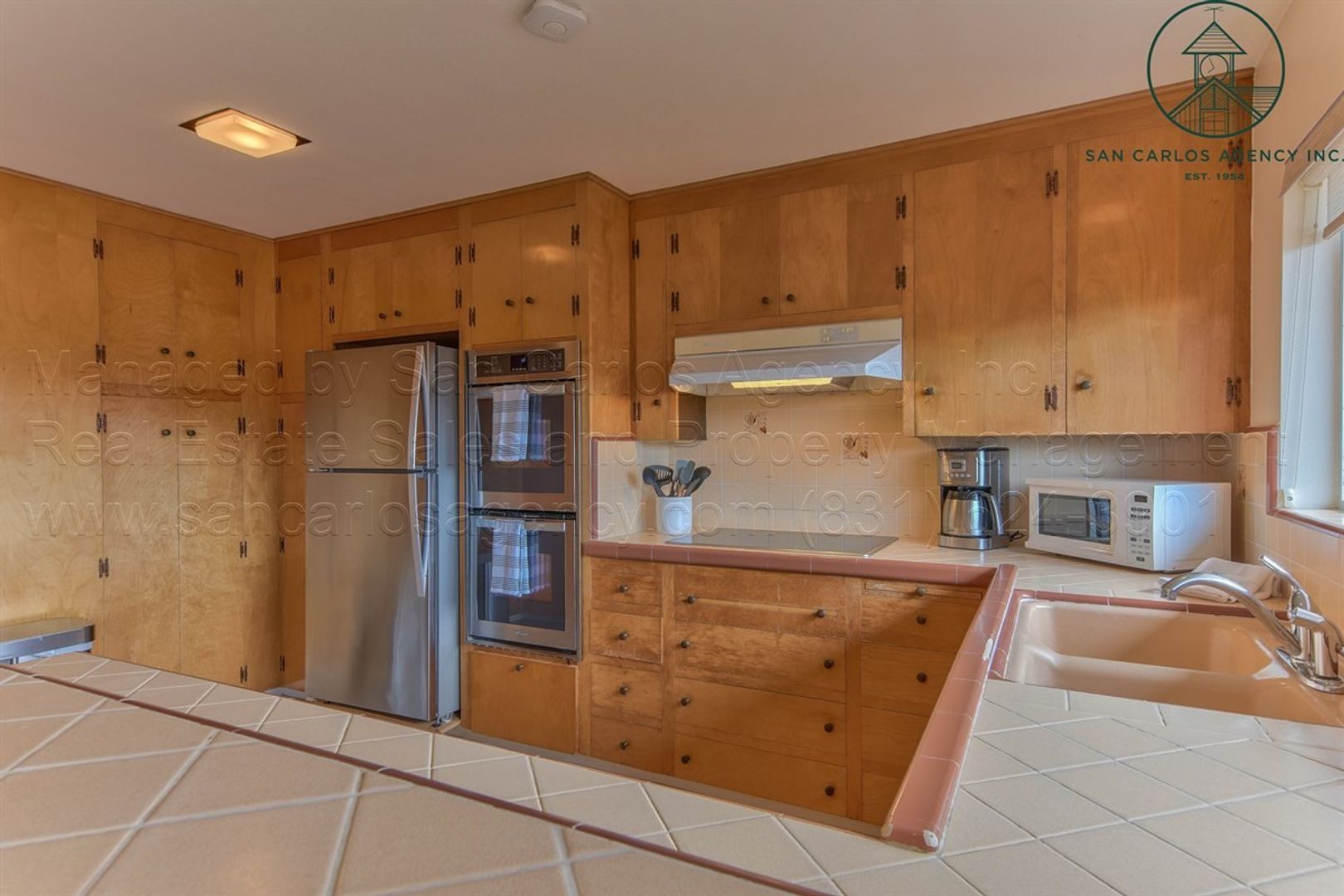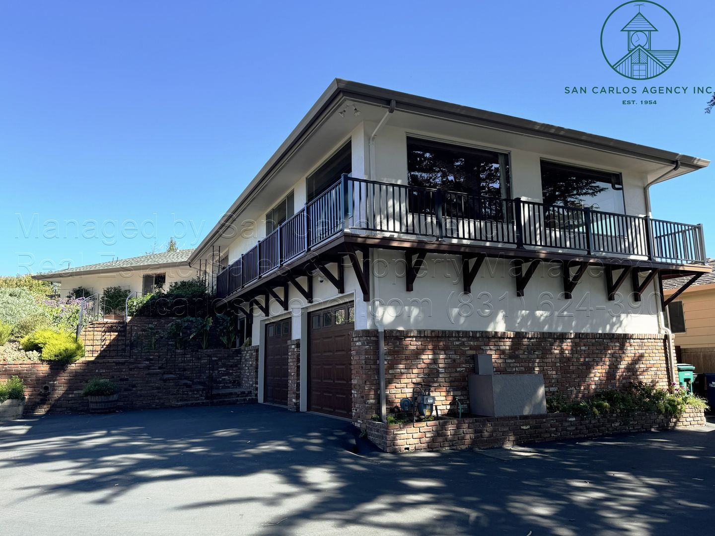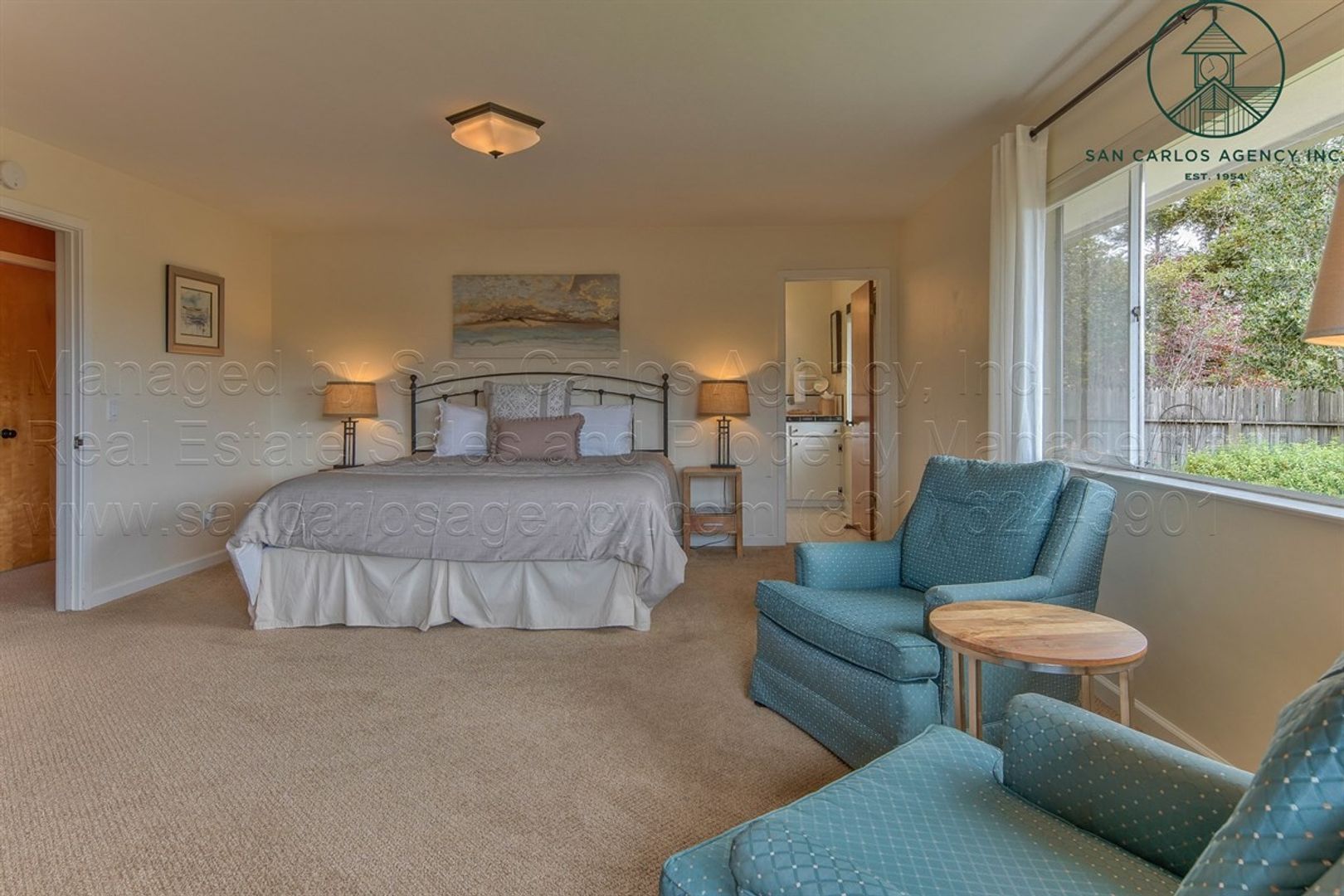 GREET - "Mission Hill" - Delightful ocean and Point Lobos views highlight this single level 2 bedroom (king, twins), 2 bath home located near Mission Ranch. Carpeted living room has open beam ceilings, huge windows with beautiful views, large flat screen television, DVD player, and plenty of seating. Fireplace (wood burning with gas jet starter) opens both to the living room and to the dining room (table seats 6). Dining Room is separated from the kitchen over a service bar. Kitchen has a new induction cook top and double electric wall ovens, microwave, dishwasher, tile counters, and plenty of storage. Sliding door leads to deck and yard area off of dining room. Entry hallway leads to bedrooms: Primary Bedroom with king bed, small seating area, TV, windows looking to side yard, and bath with tub and separate shower. Guest bedroom is at the end of the hall with twin beds. Guest bath (shower stall) and closet with washer/dryer are also located off of the hall. Carpet throughout. Outside features a private front patio with incredible views out to Pt. Lobos (table with seating for 4), and a separate patio in back yard area with table that seats 4. Plenty of off-street parking, as well as a two car garage with parking for one. Wi-Fi. NO PETS. NO SMOKING. PROPERTY CODE: GREET (**NOTE: (1) there is 1 exterior camera attached to a security system mounted above the front door. The system is not monitored, but can be viewed on a screen inside the house. Six to twelve month lease term. Contact San Carlos Agency, Inc. at (831) 624-3901 or rentals@sancarlosagency.com to schedule a showing. Visit www.SanCarlosAgency.com or www.CarmelRentalProperties.com.